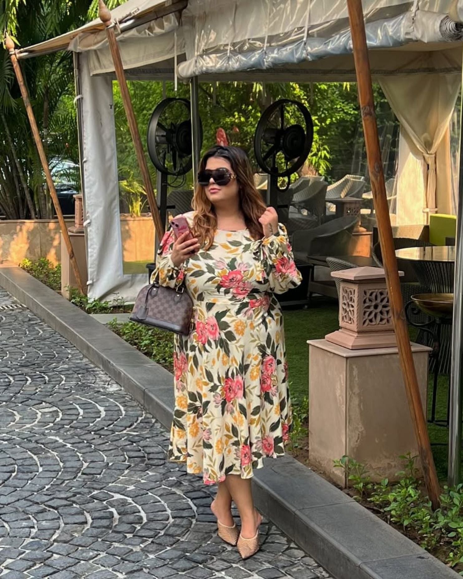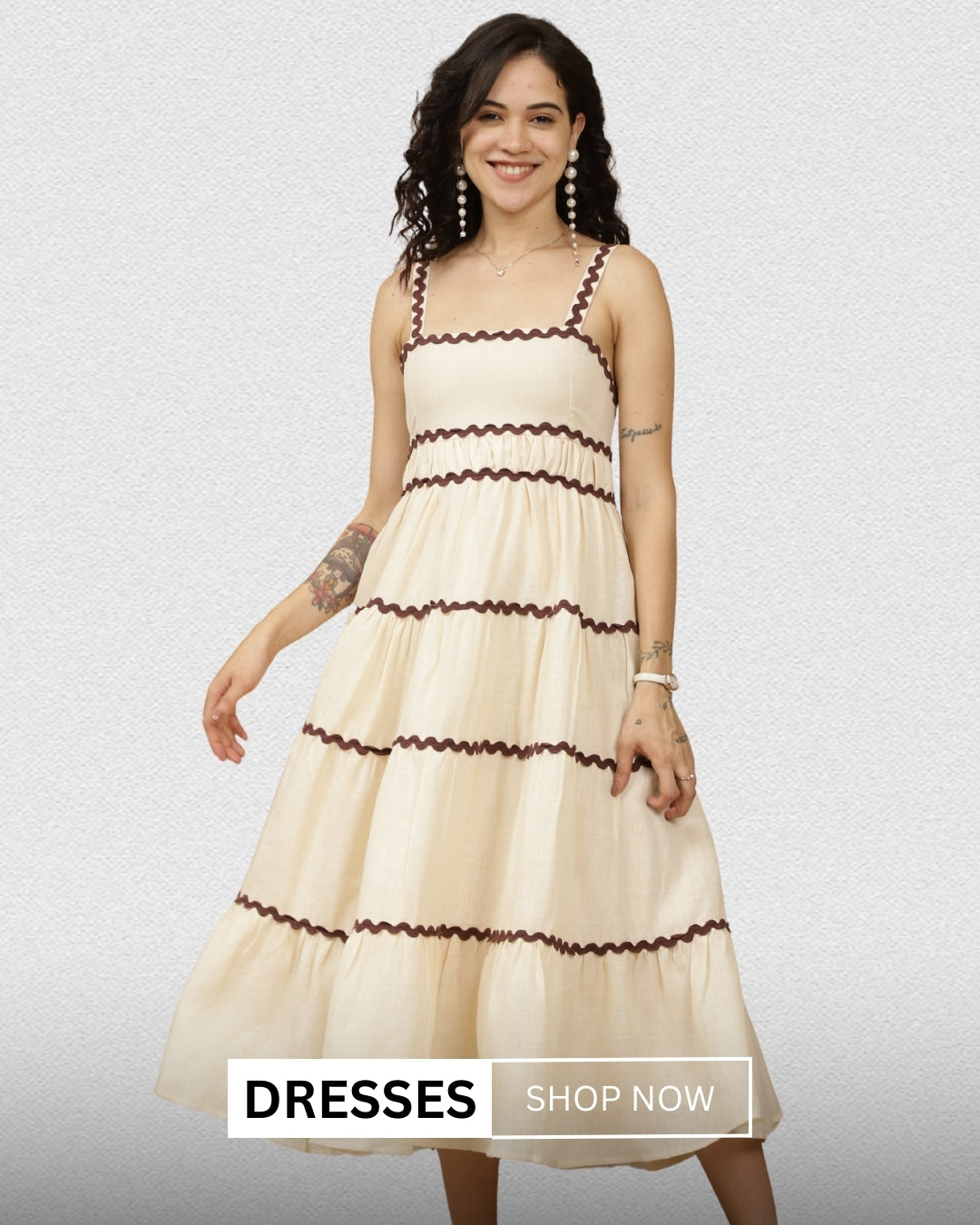 Step out in style with our brown printed knee-length dress, featuring delicate pintuck details on the chest. Crafted with a round neck and full sleeves, this dress combines classic design elements with a modern print for a sophisticated and versatile look. Perfect for both office and casual outings.